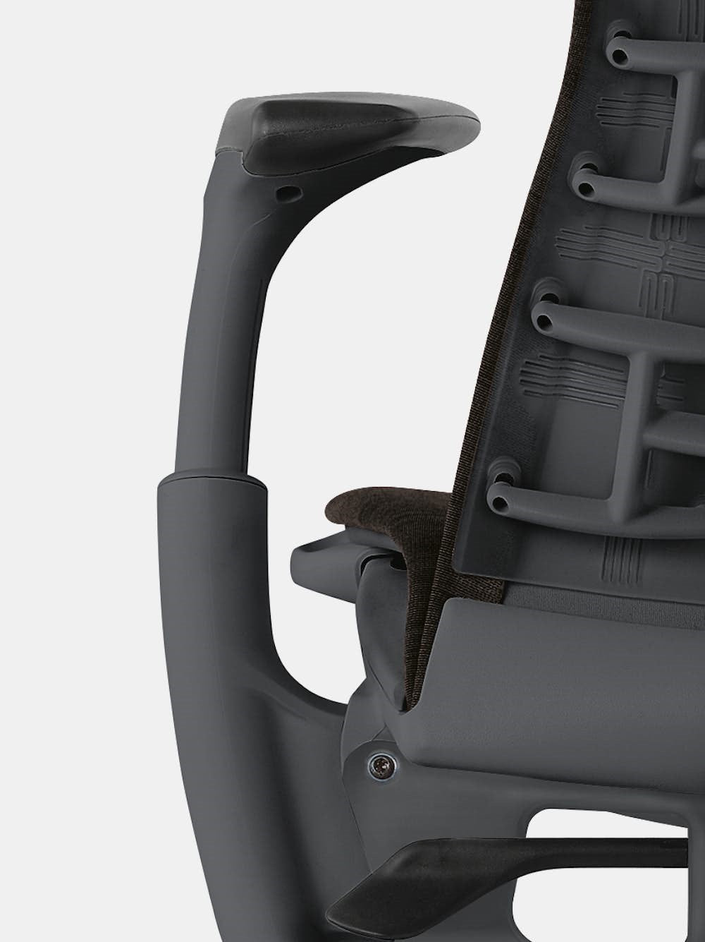 Embody’s Pixelated Support system distributes your weight evenly, creating a sense that you are floating. The support reduces pressure and encourages movement, both of which are key to maintaining focus and healthy circulation. Mimicking the human body, the chair’s narrow back has a central spine and flexible ribs. A Backfit adjustment controls them, allowing you to position the backrest in line with your spine’s natural curve so that you have a neutral, balanced posture. Embody’s seat features four different support layers. Together, they mold to your shape while allowing for airflow, keeping you cool and comfortable as you sit. A pneumatic seat lift and repositionable chair arms help you further tailor Embody to your specifications.