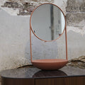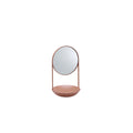 Round mirrored glass with reverse in rose beige lacquered steel.